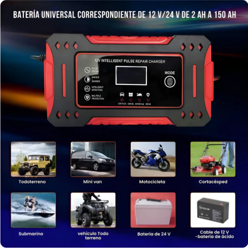 ¿Tienes una batería descargada o con fallos? ¡Este cargador inteligente es la solución definitiva! Diseñado para baterías de 12V y 24V , desde 2 AH hasta 150 AH , es el aliado perfecto para una amplia gama de vehículos y equipos, desde tu moto hasta tu camioneta todoterreno 🚗🏍️🚜.